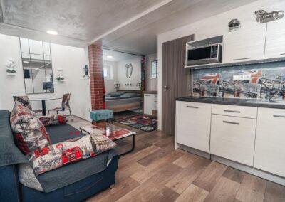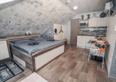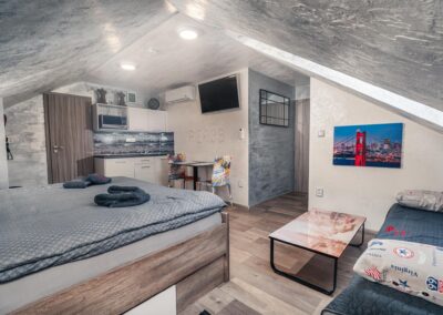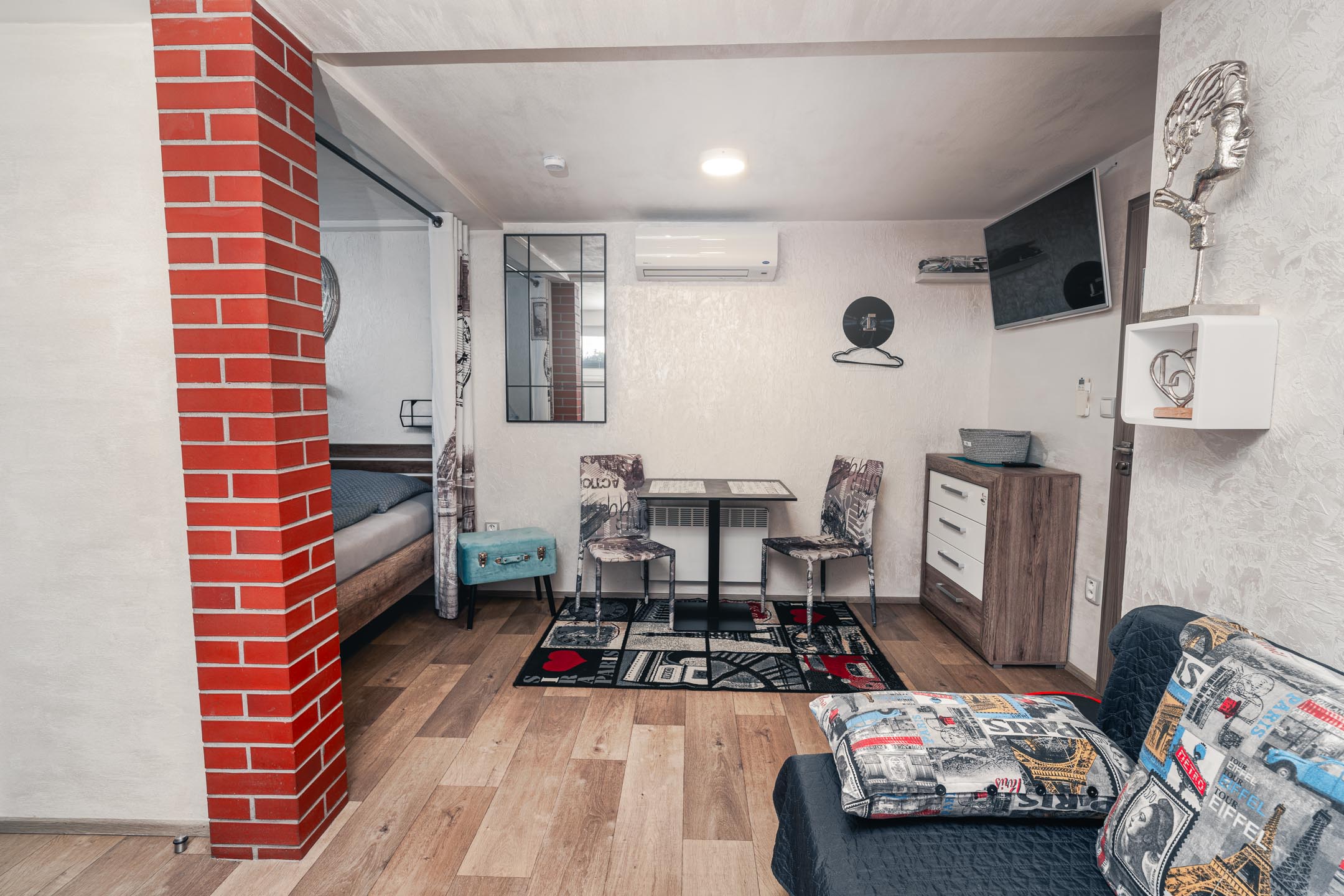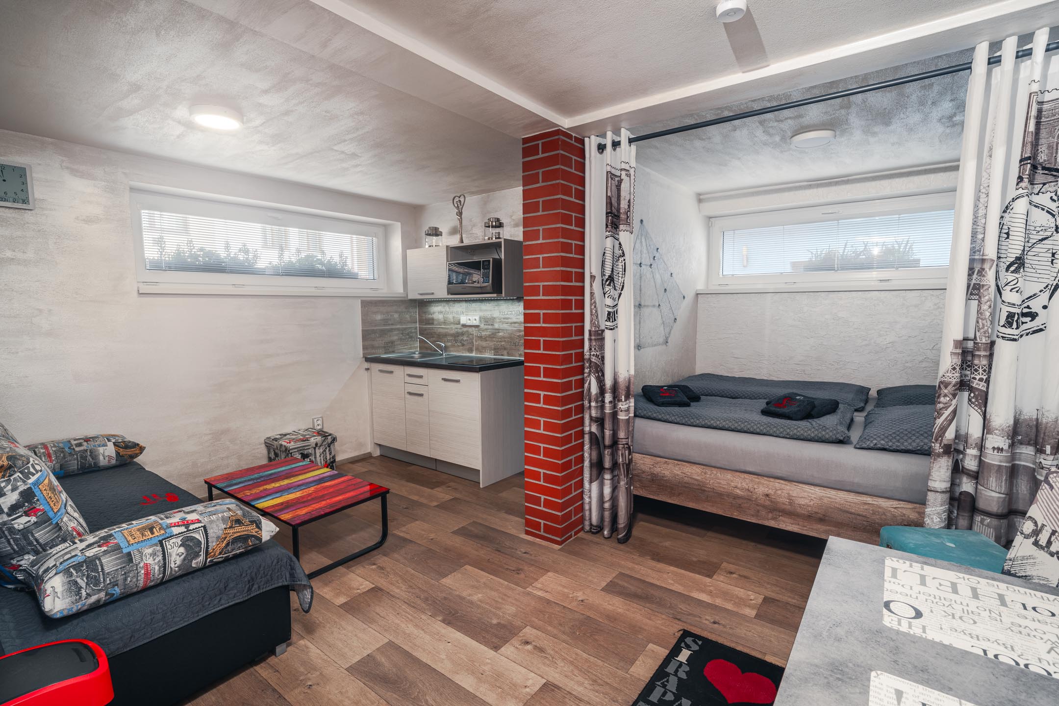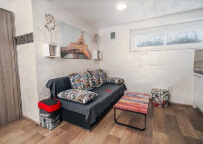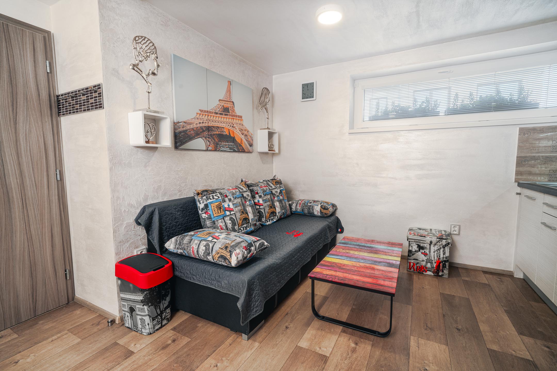 Máte rádi romantiku? Tak zavítejte pod Eiffelovku. Designové studio s motivy nejromantičtějšího místa na světě. Obsahuje jednu manželskou postel a rozkládací pohovku. Jedná se o plně vybavené studio obsahující kuchyň, WC, koupelnu.