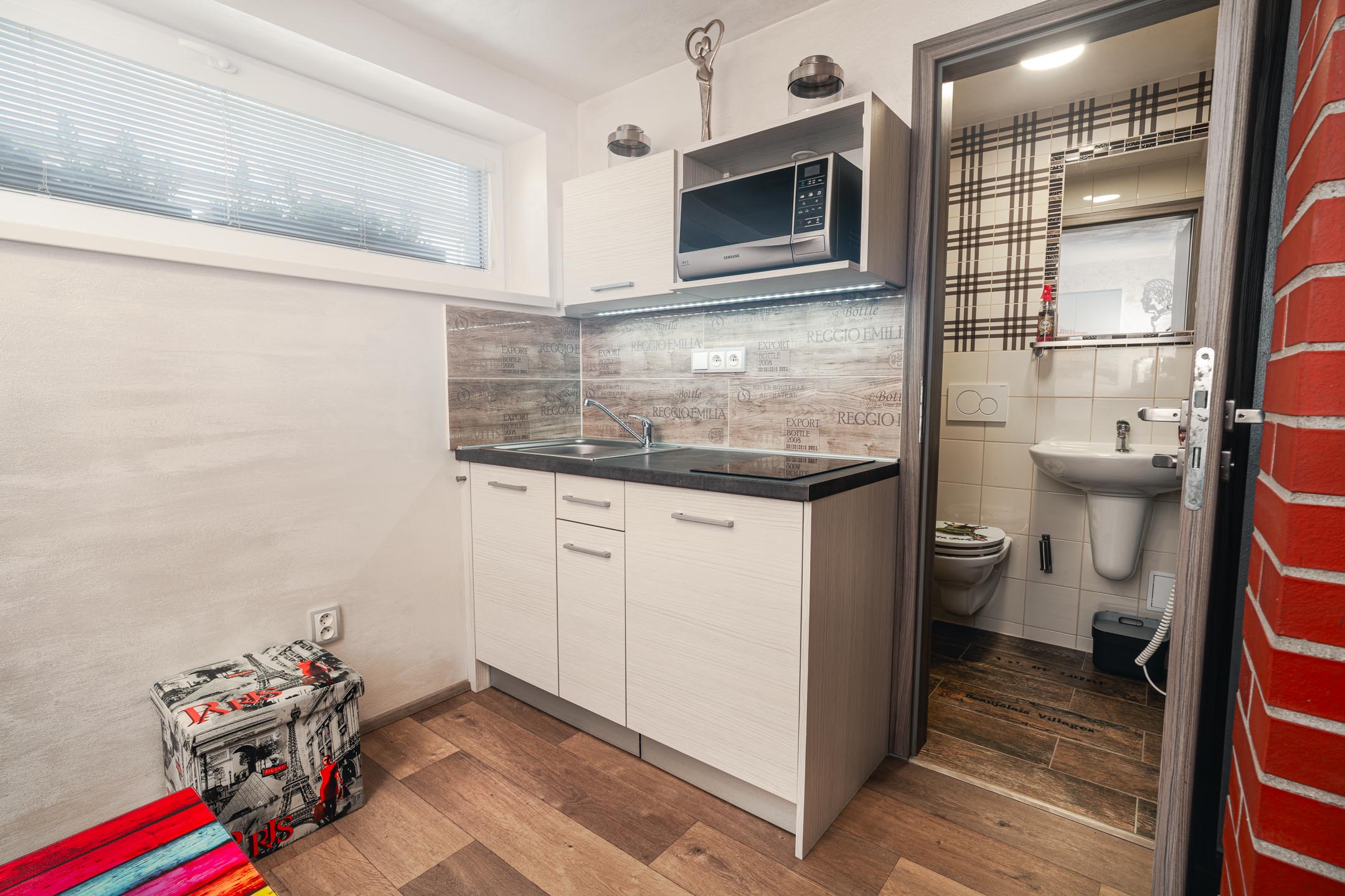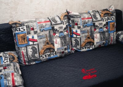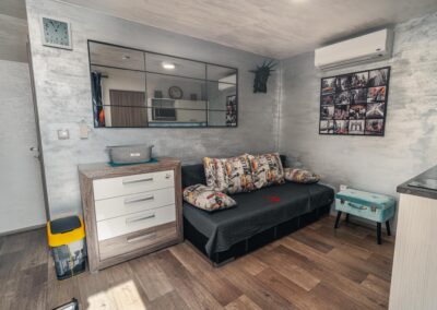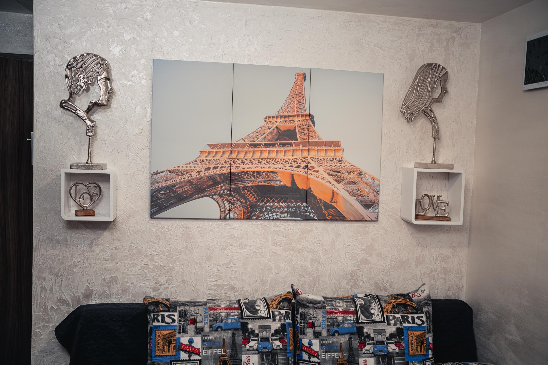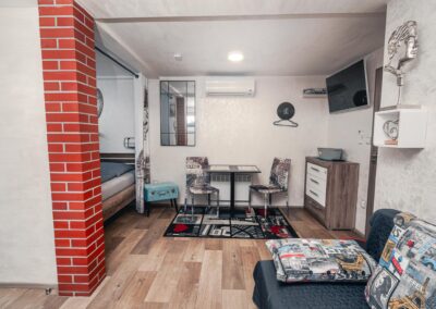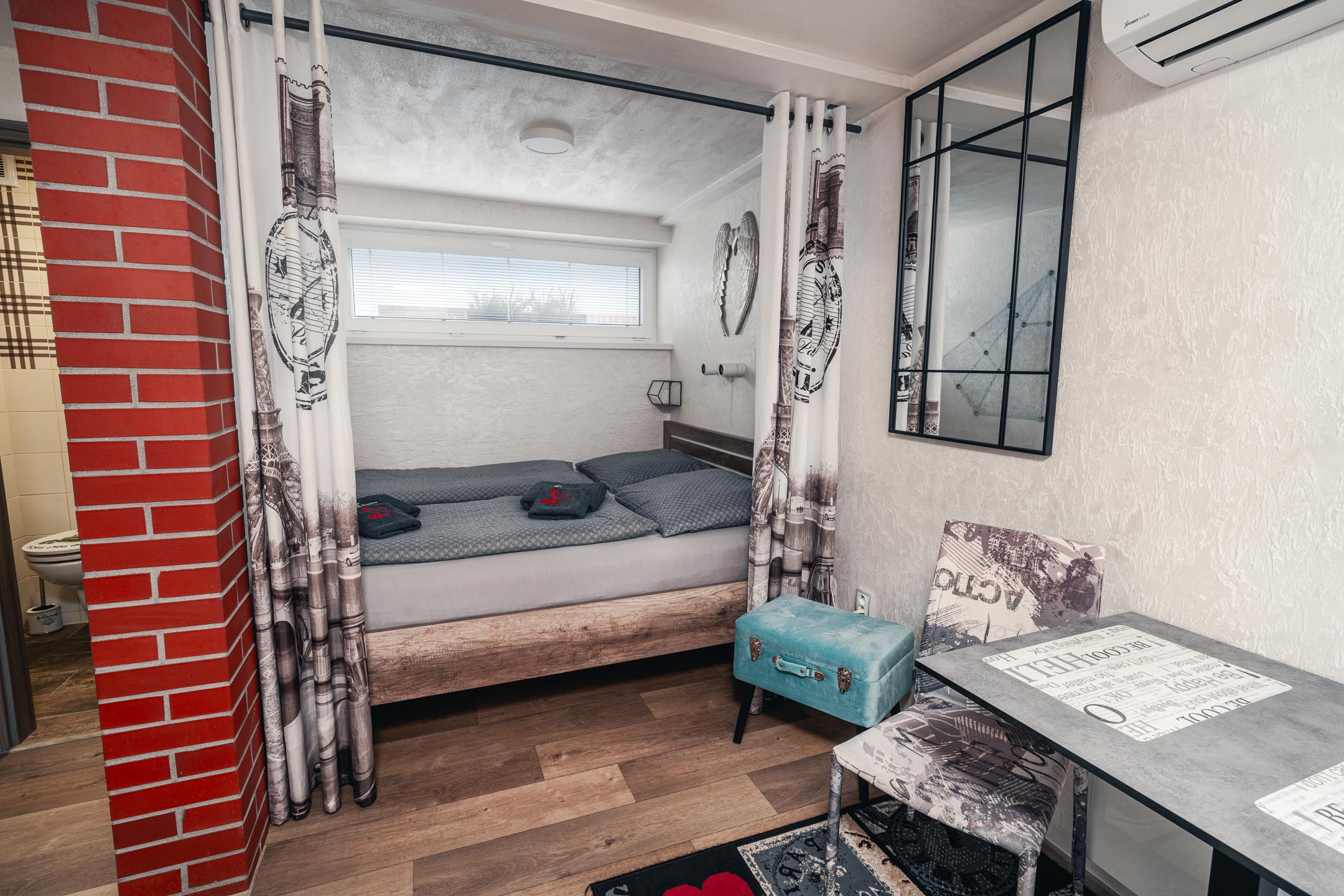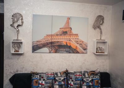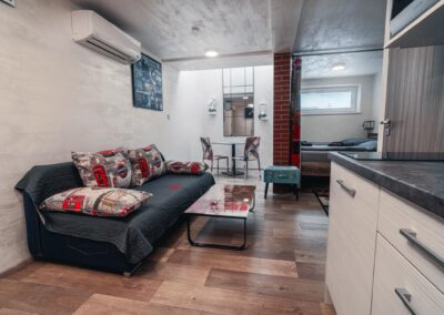 Máte rádi romantiku? Tak zavítejte pod Eiffelovku. Designové studio s motivy nejromantičtějšího místa na světě. Obsahuje jednu manželskou postel a rozkládací pohovku. Jedná se o plně vybavené studio obsahující kuchyň, WC, koupelnu.