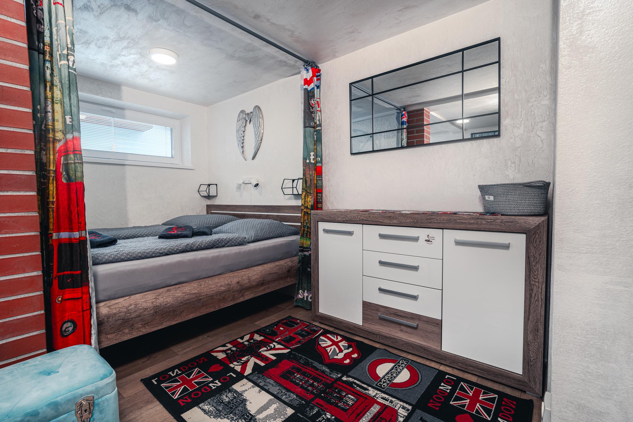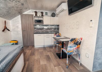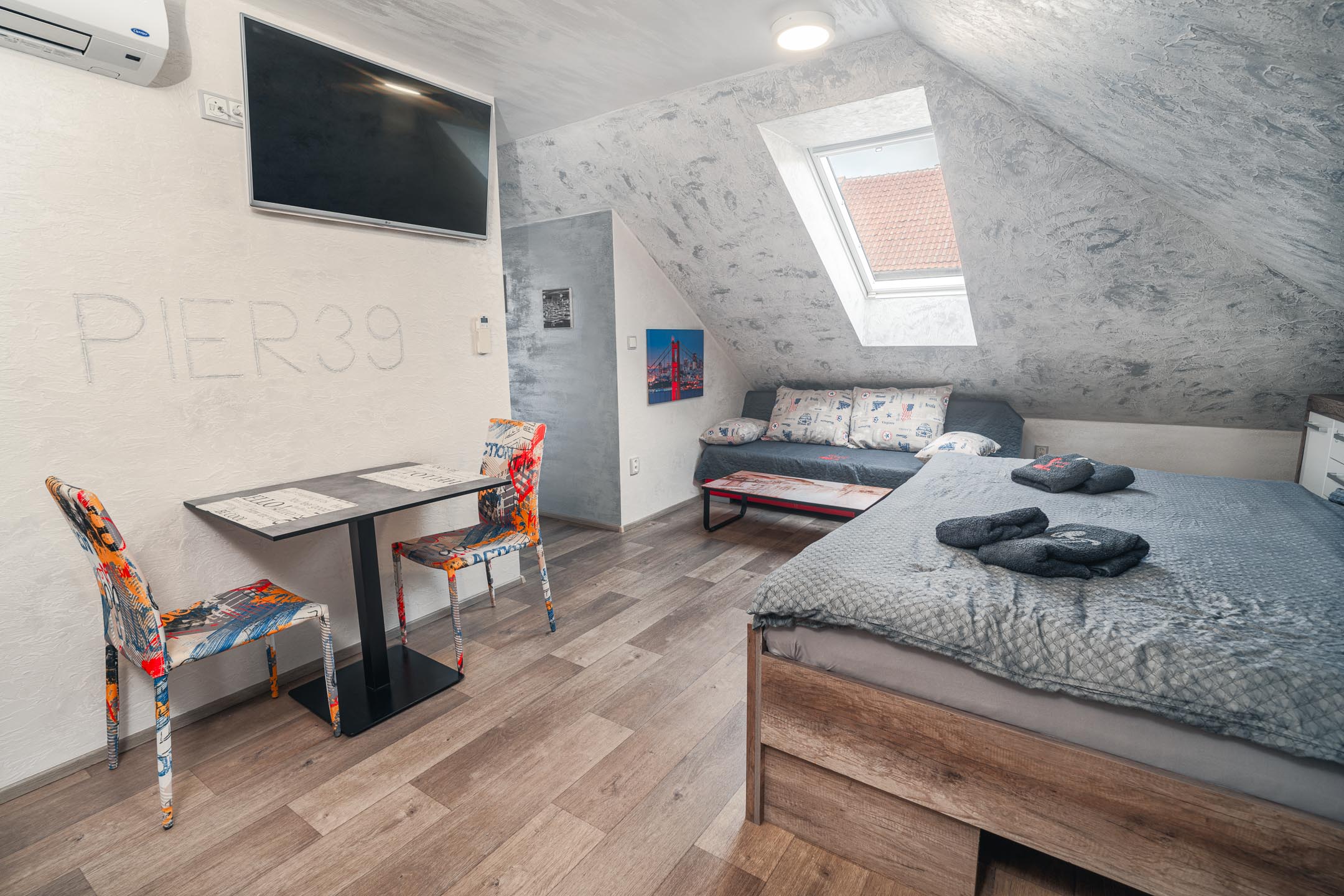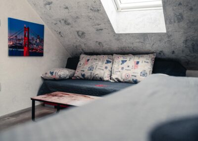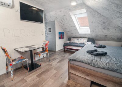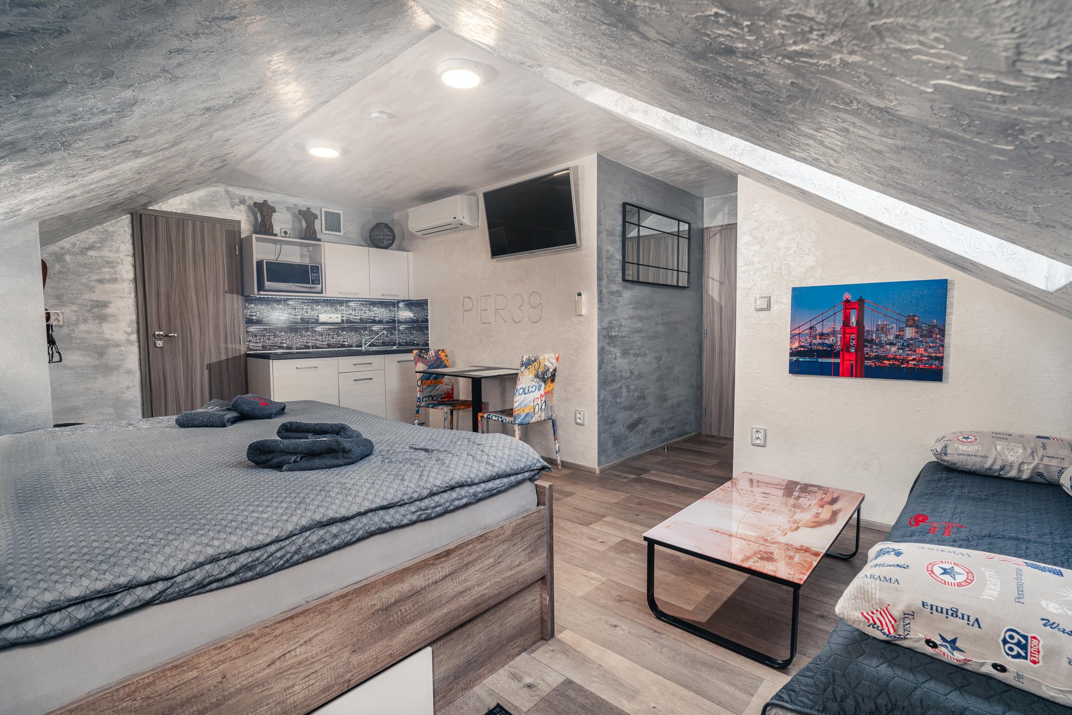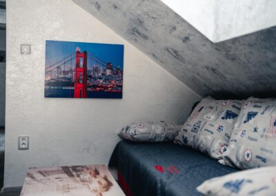 Naše brána k Americe není ze zlata, ale spát se vám bude hezky. Designové studio s motivy metropole USA s dominantou Golden Gate Bridge. Obsahuje jednu manželskou postel a rozkládací pohovku. Jedná se o plně vybavené studio obsahující kuchyň, soukromé WC a koupelnu.