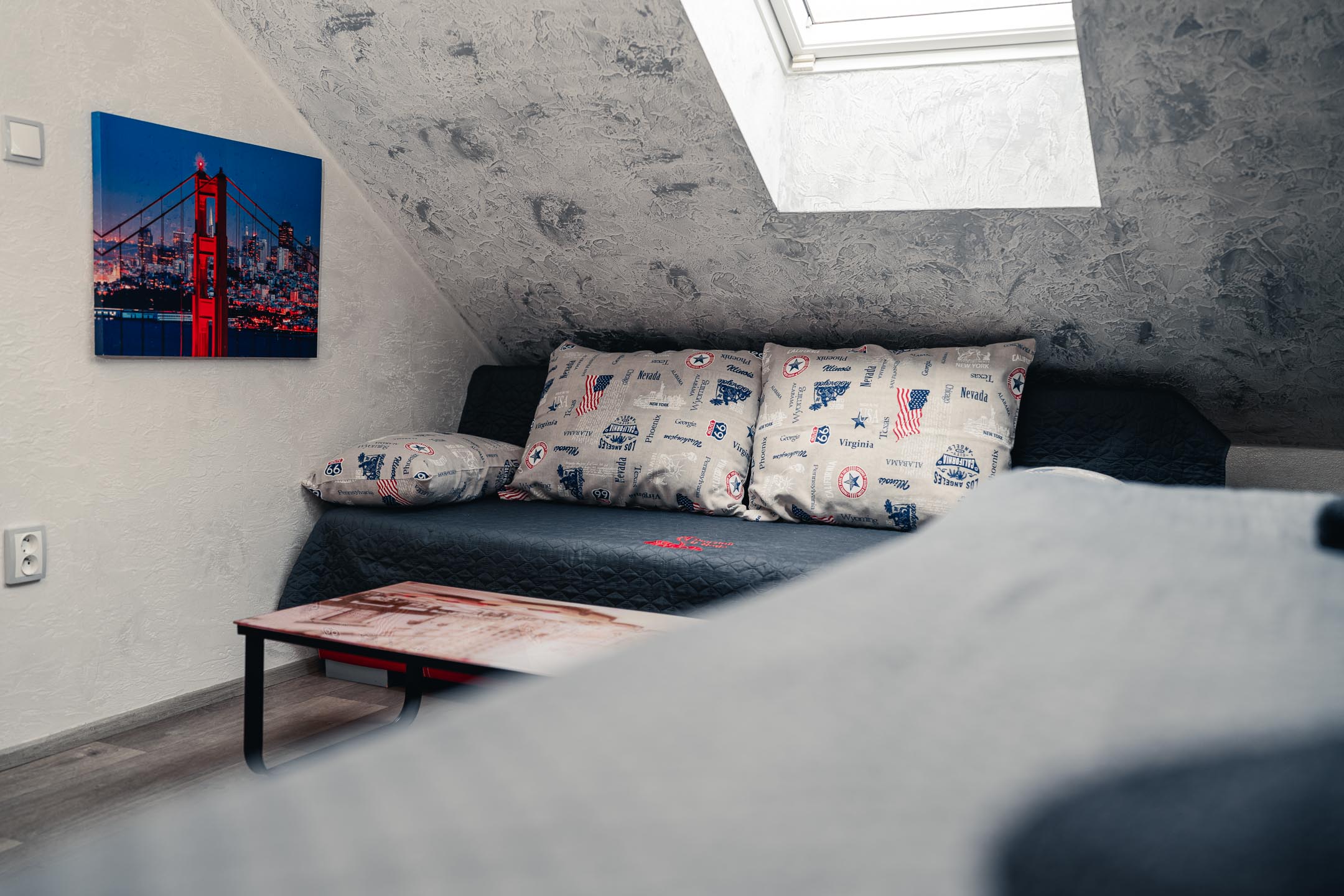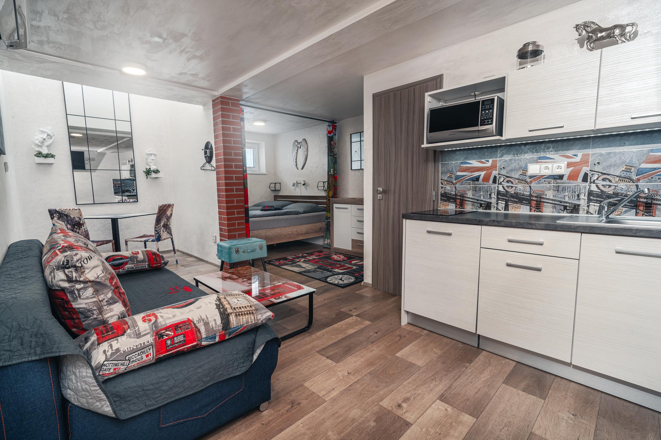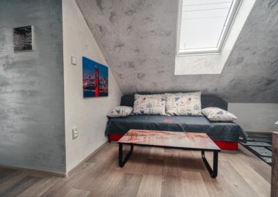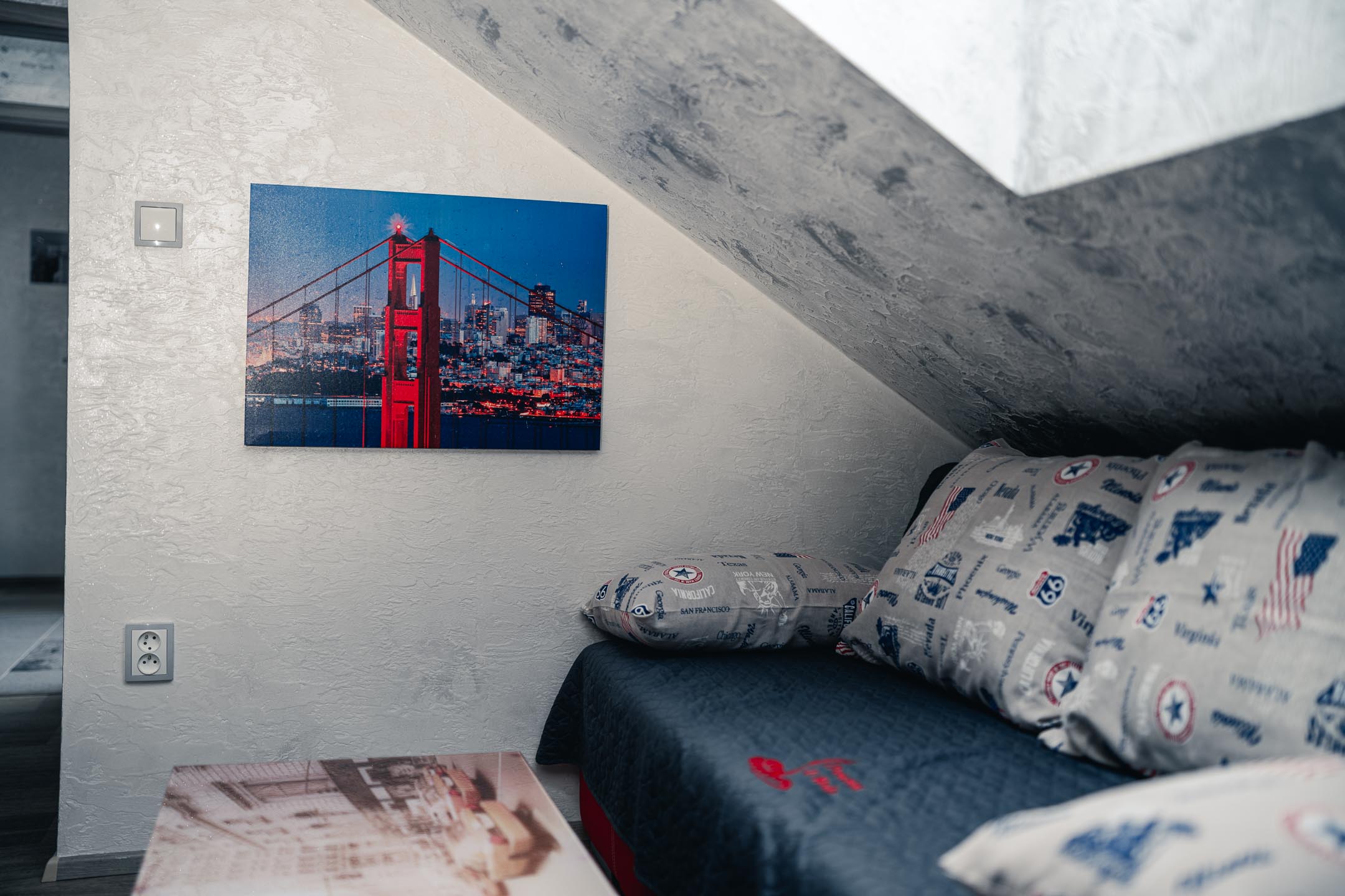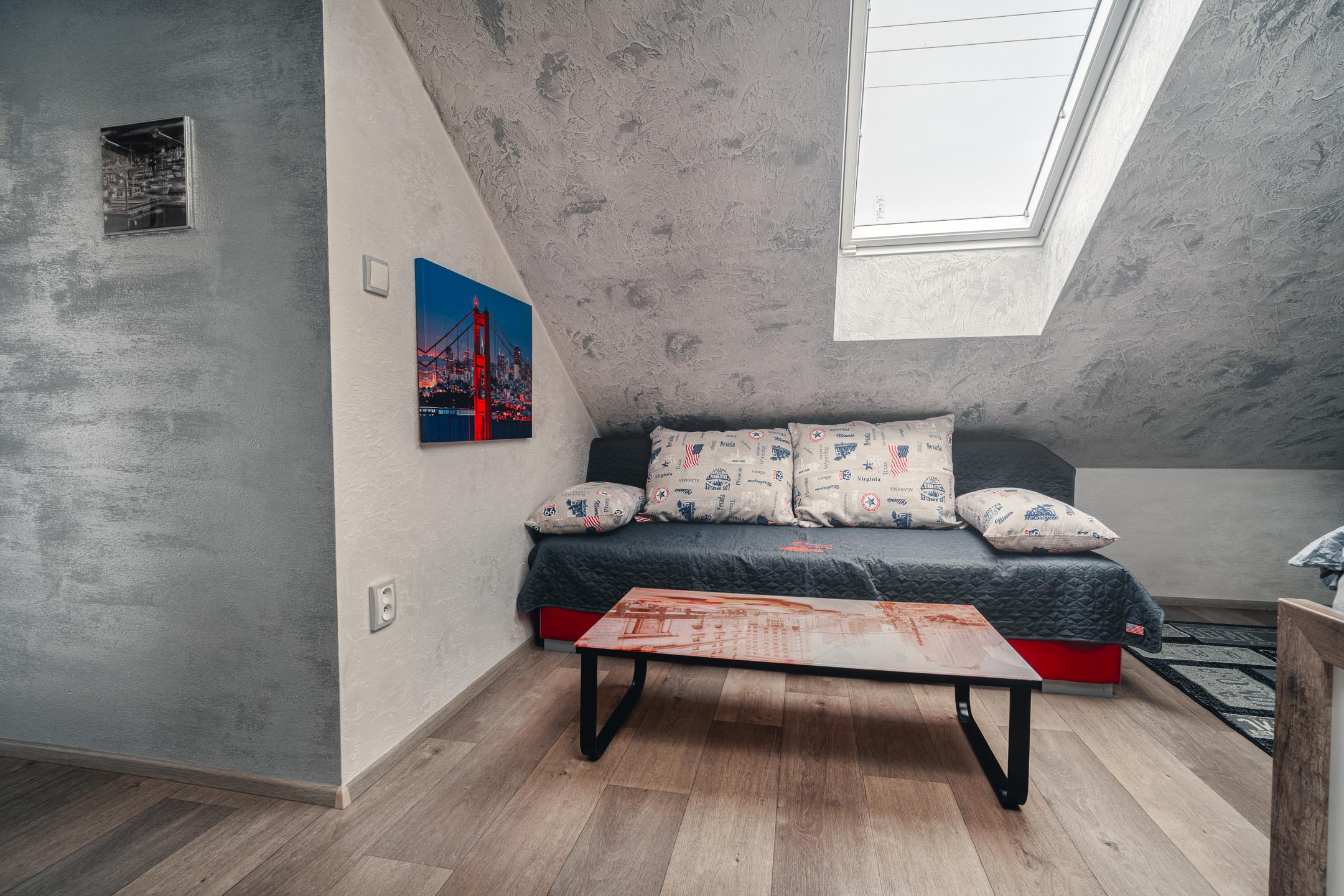Naše brána k Americe není ze zlata, ale spát se vám bude hezky. Designové studio s motivy metropole USA s dominantou Golden Gate Bridge. Obsahuje jednu manželskou postel a rozkládací pohovku. Jedná se o plně vybavené studio obsahující kuchyň, soukromé WC a koupelnu.