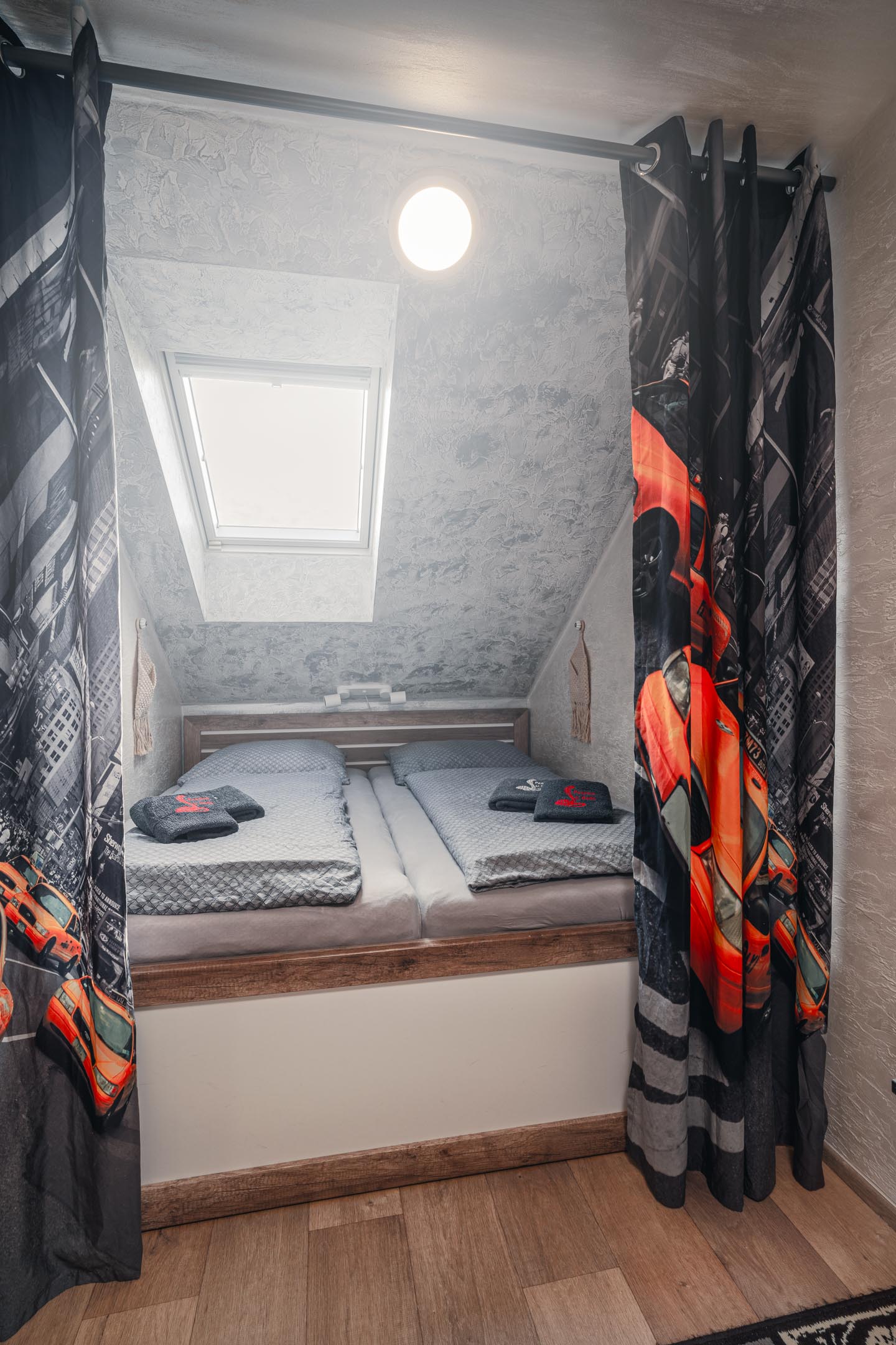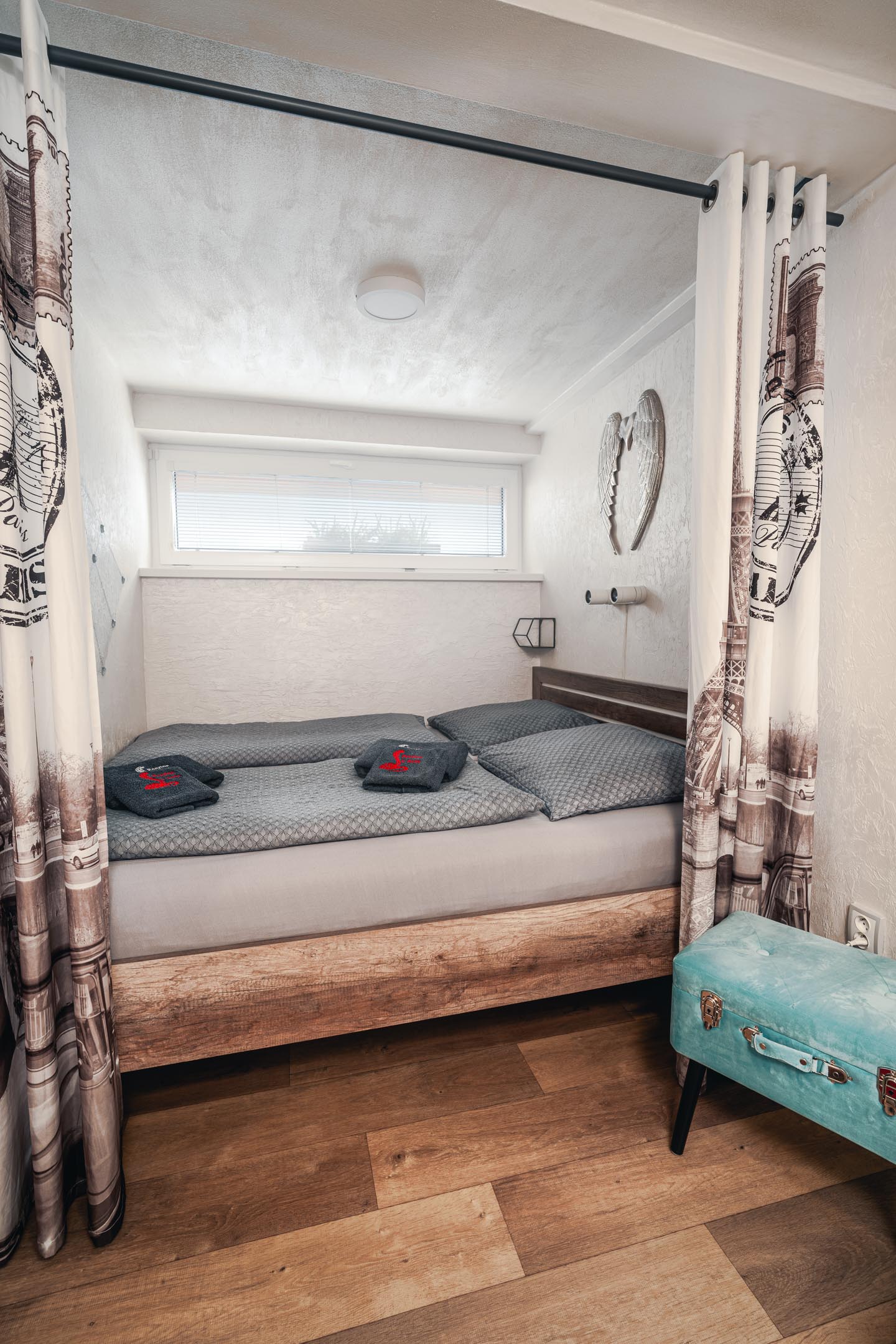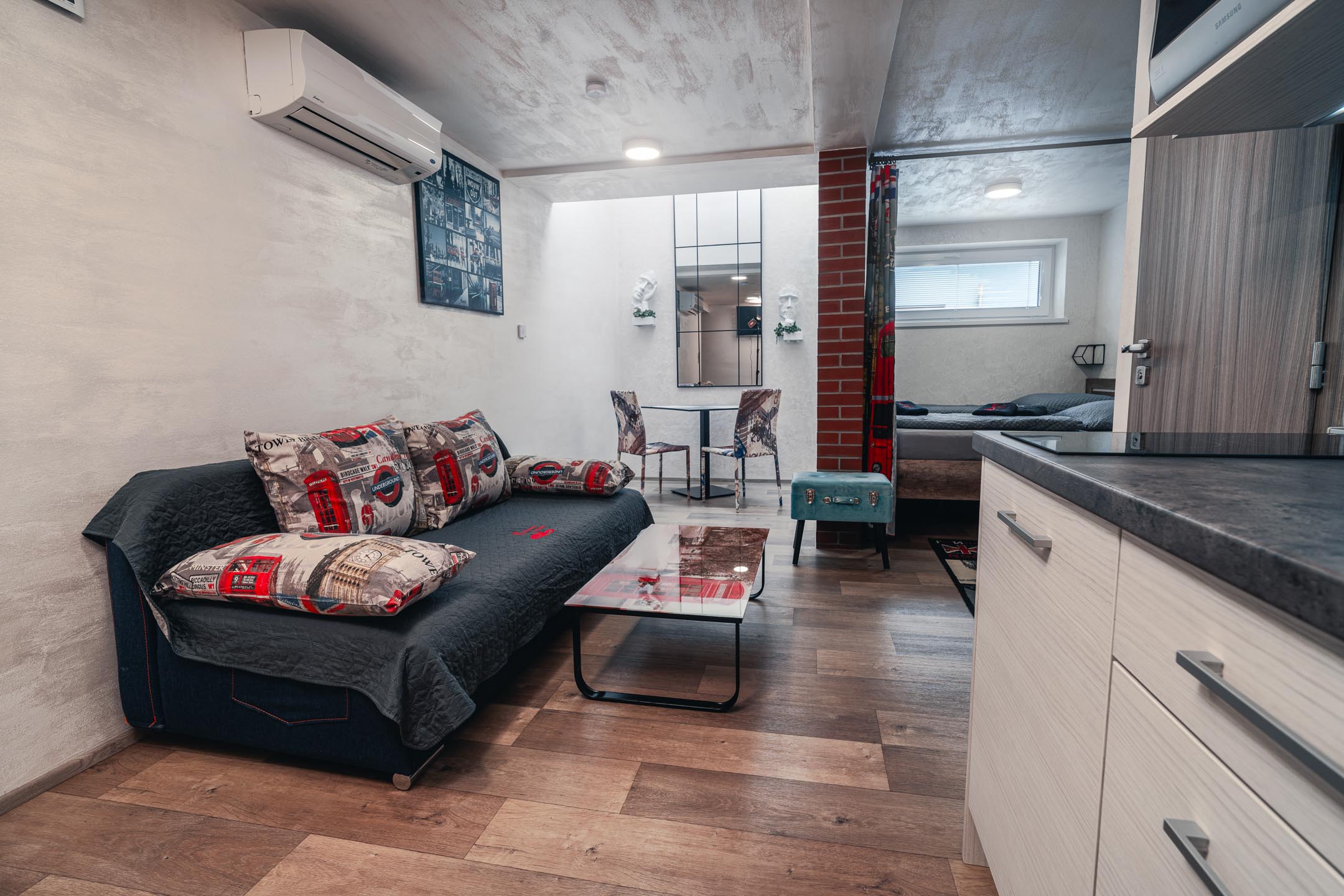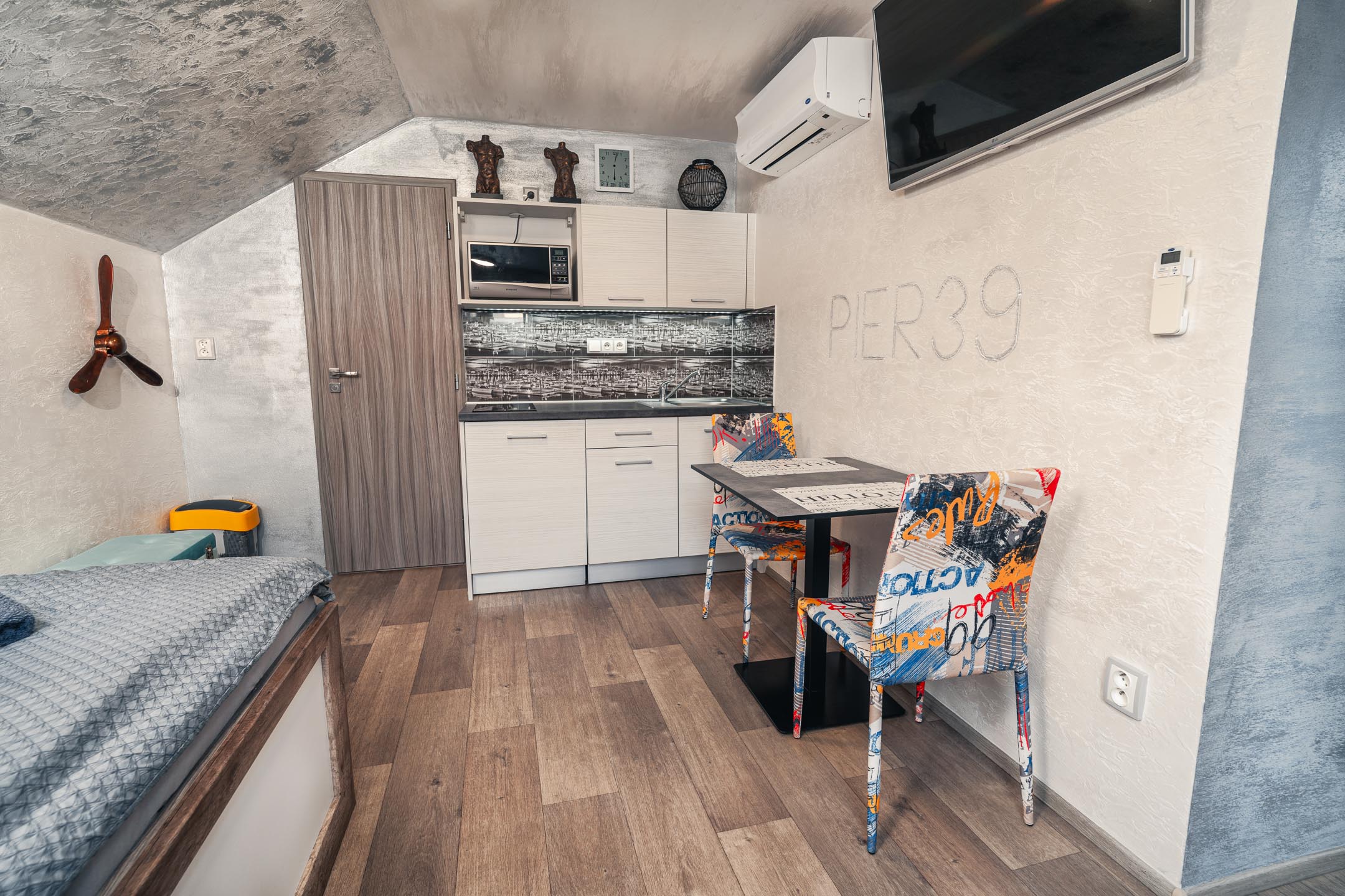 Naše brána k Americe není ze zlata, ale spát se vám bude hezky. Designové studio s motivy metropole USA s dominantou Golden Gate Bridge. Obsahuje jednu manželskou postel a rozkládací pohovku. Jedná se o plně vybavené studio obsahující kuchyň, soukromé WC a koupelnu.