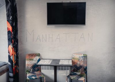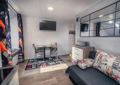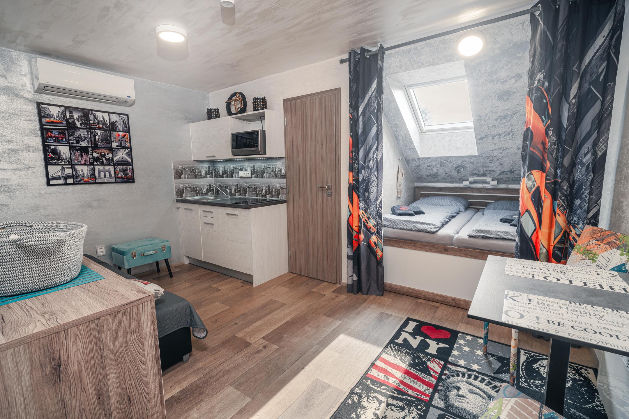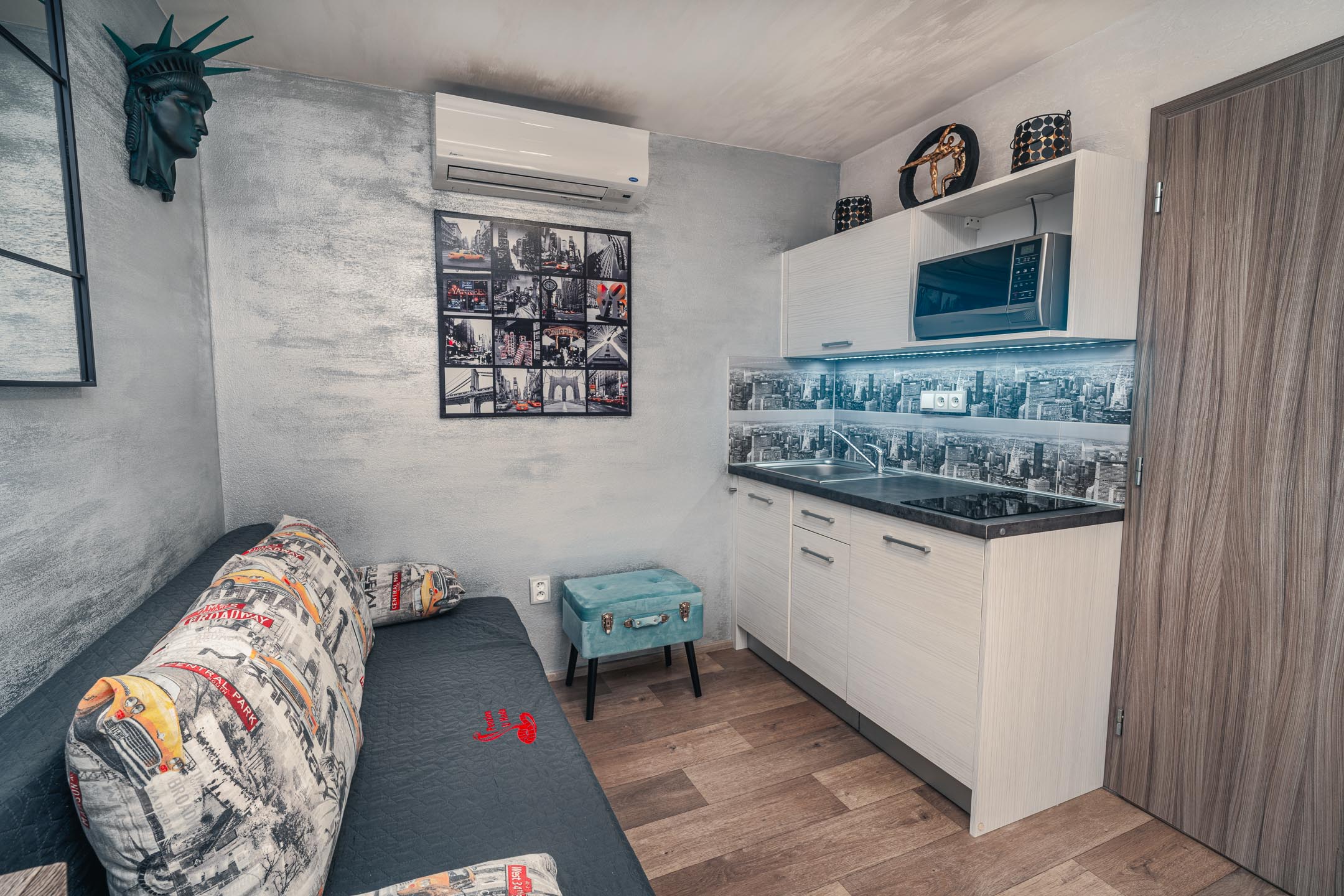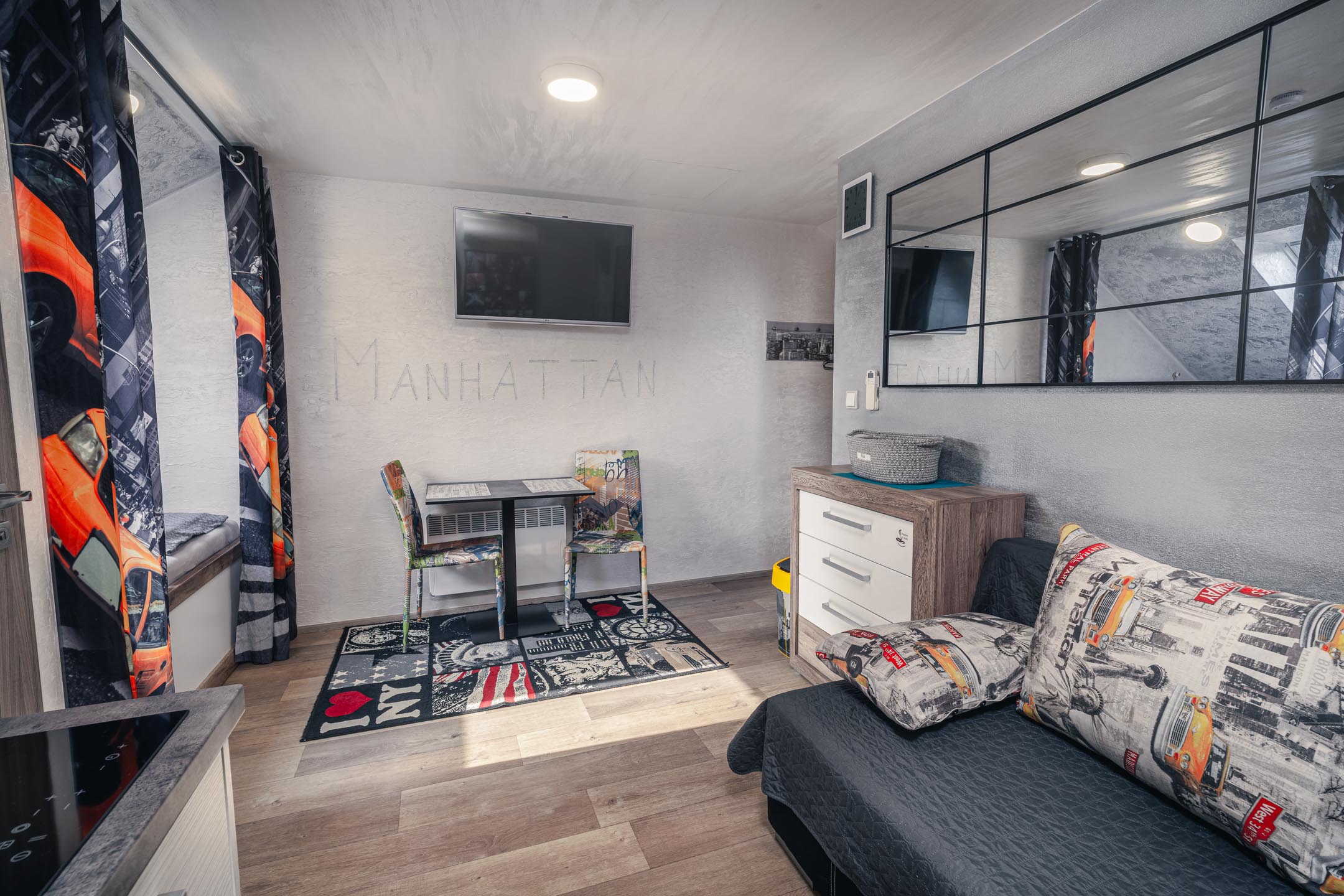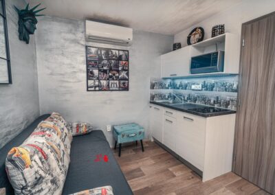 Je libo na Manhattan? U nás ani nemusíte přes Brooklynský most. Designové studio s motivy všudypřítomných žlutých taxíků a mrakodrapů. Obsahuje jednu manželskou postel a rozkládací pohovku. Jedná se o plně vybavený apartmán obsahující kuchyň, WC, koupelnu.