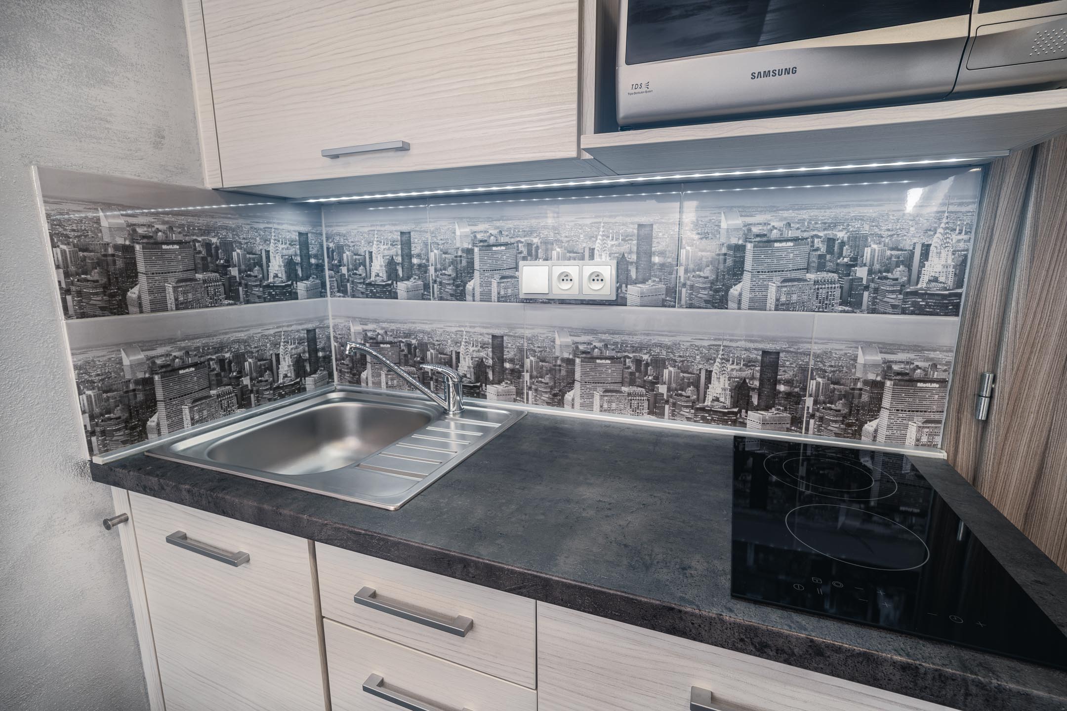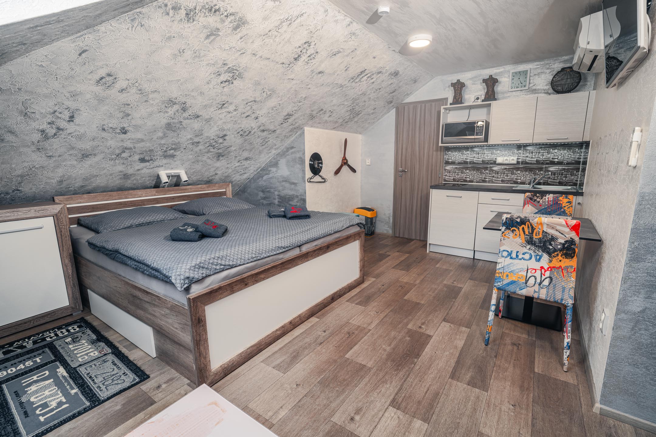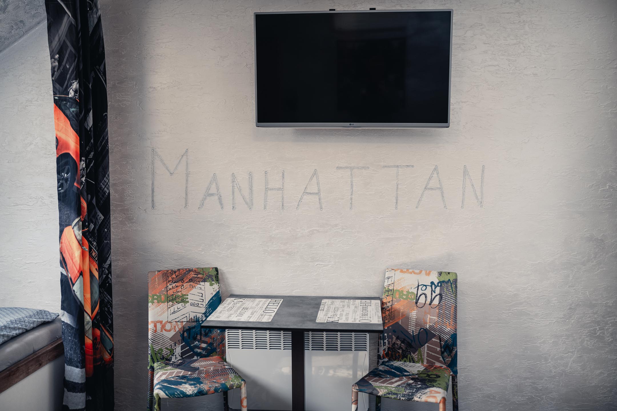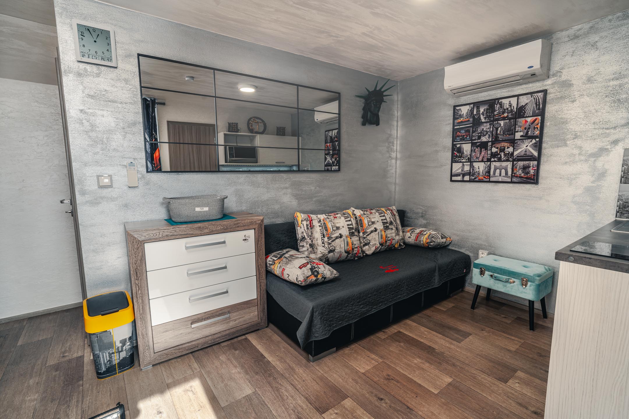 Je libo na Manhattan? U nás ani nemusíte přes Brooklynský most. Designové studio s motivy všudypřítomných žlutých taxíků a mrakodrapů. Obsahuje jednu manželskou postel a rozkládací pohovku. Jedná se o plně vybavený apartmán obsahující kuchyň, WC, koupelnu.